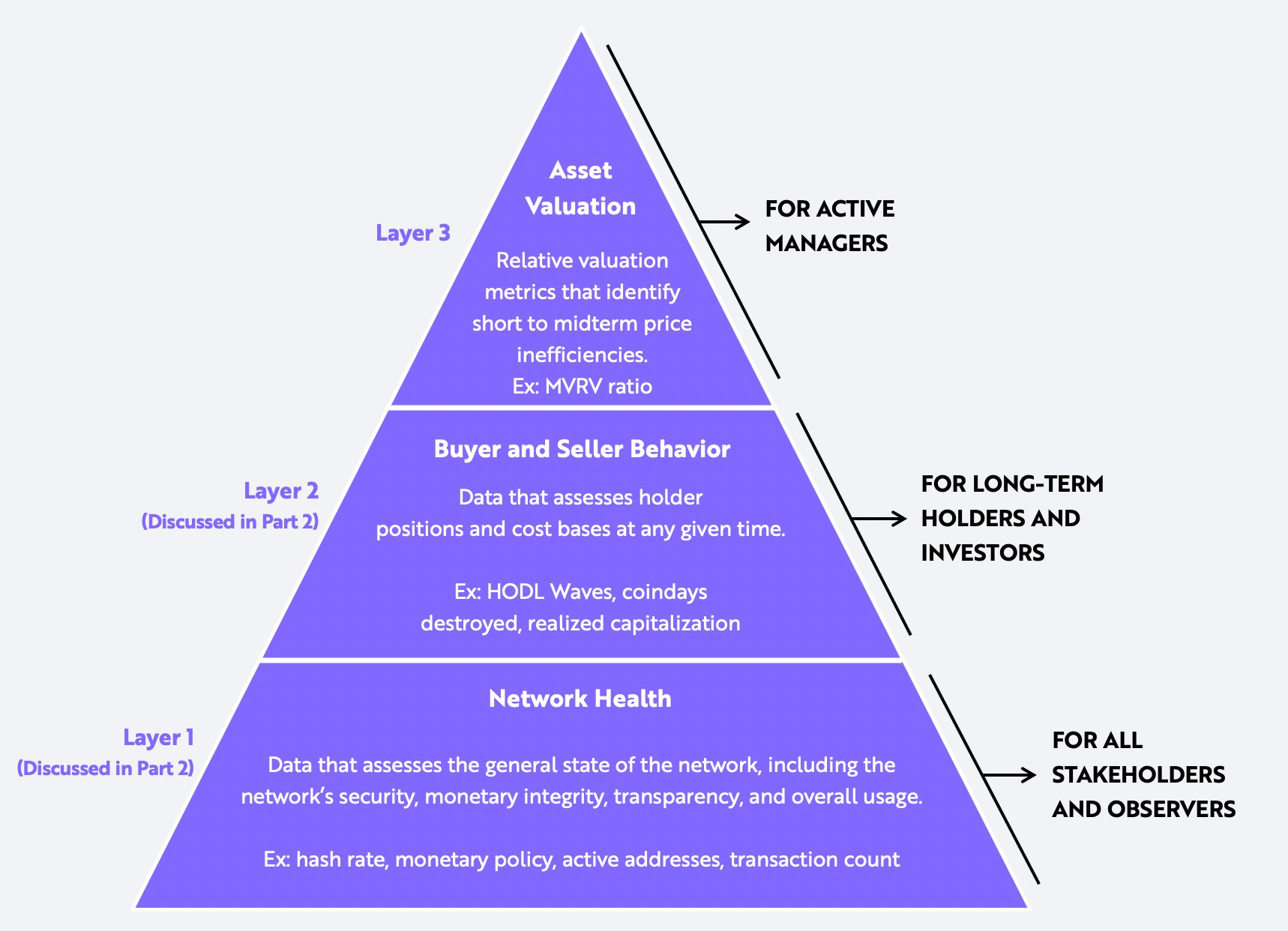 - Bottom Layer: Assesses the health of the Bitcoin network.